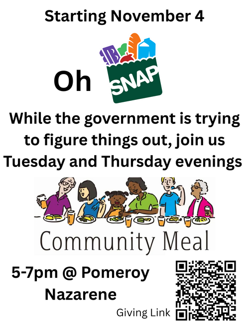 Due to the continued government shutdown, as of Nov 1, food stamps (SNAP) distributions will not be going out. This is going to cause significant hardship for many in our community. Unfortunately, this is also happening at a time when food banks are running low. We have seen this here already, and even in the amount of food coming in from 2nd Harvest. To help fill this gap, starting NOVEMBER 4, we are going to be hosting Community Dinners on Tuesday and Thursday evenings (5-7pm).