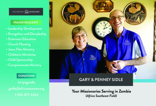 Gary & Penney have lived in Lusaka, the Capital city of Zambia, and served there for 22 years. God continues to move in great ways and is building a wonderful ministry team in Zambia. To Him goes all the glory and honor!! Briefly, there are five of us Sidles with the three of our children growing up in Zambia. They include Lindsay (married now living in Bucyrus, Ohio with two daughters), Alyssa (graduated from Mt. Vernon Nazarene University and working at the MVNU Radio Station) and Josiah (is attending Mt. Vernon Nazarene University and is set to graduate May 2024).